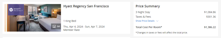 Alternatively, you could transfer points to Hyatt to book your stay at the Hyatt Regency San Francisco. The award cost is 17,000 points per night, totaling 51,000 points for your three-night visit.