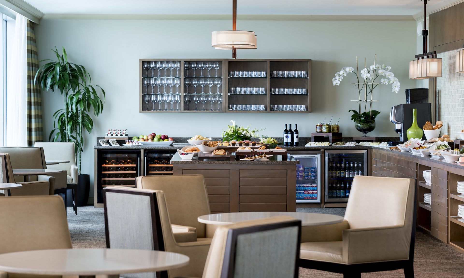 At the club lounge inside the Hyatt Regency Orlando, fill up on coffee, pastries, yogurt and fresh foods before a day at the local theme parks — or have a glass of wine at the lounge upon return. Image courtesy of Hyatt.