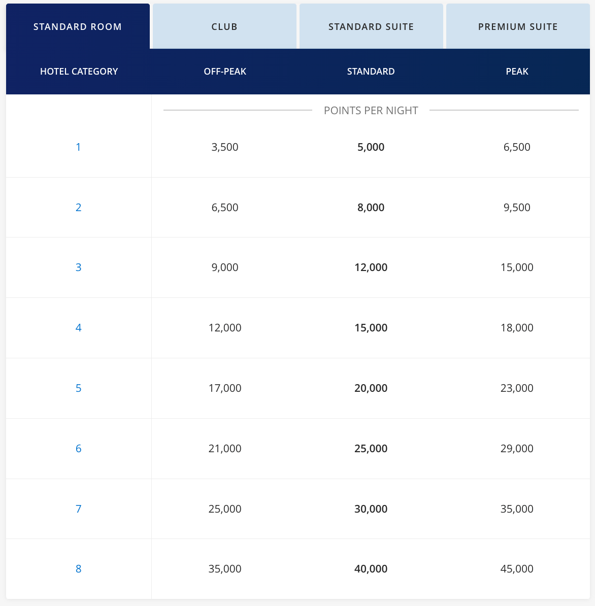 Award categories range from Category 1 to Category 8, with prices for a standard room award ranging from 5,000 points per night to 40,000 points per night. If you’re able to book an off-peak rate that’s even better.
