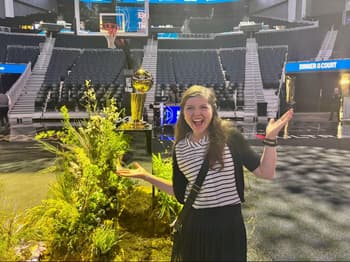Decor and trophies on display at Dinner on the Court in March 2026 at the Chase Center in San Francisco (Photo by Sally French/NerdWallet)