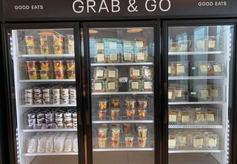 Refrigerators stock a wide array of soft drinks, juices and smoothies. A refillable water bottle station is sure to be a big hit, too. Other snacks on offer include various sandwiches, wraps, salads, hard-boiled eggs, crudité and cut fruit.